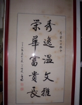 郭阿壽先生1918年出生於楊梅西高山頂,就是 他是楊梅公學校 (楊梅國小)五秀才之ㄧ,他個人 非常努力並具有很高的語文天份,能說能寫;他精通 客家語、閩南語、泰雅語、國語、日語、英語。他不 只文章好,詩詞、對聯、公文、契據都拿手。在楊梅 多處寺廟他撰擬並親自揮毫的楹聯,與楊星亭、鄭漢 青等同受尊榮。 雖然他是五秀才中唯一不具大學學歷,但是服務 政界卻頭角崢嶸。他曾任縣長主秘,亦曾代理楊梅鎮 長,在任內排解糾紛、增設學校、公共造產頗多建樹 。 郭先生退休後過閒雲野鶴的生活,也到世界各處 |