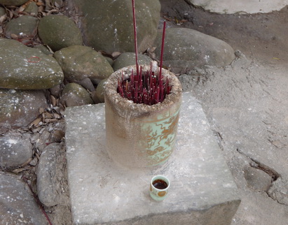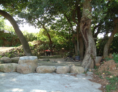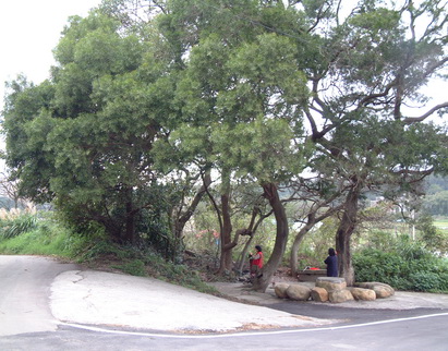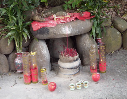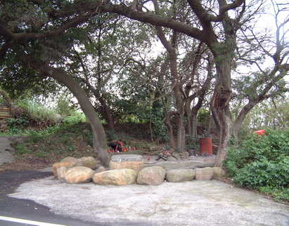 現存的伯公祠有的巍峨華麗,有的樸實莊嚴,有的金碧輝煌,有的小家碧玉,僅少數保存最原始的形貌。水尾 地區伯公大都已改建,三石伯公原貌就只剩下兩處了。這個伯公位於夾漥潭南側,即南圳取水口南面小坡上。因在 新建社區新梅一街旁,故以「新梅伯公」表其名。信仰在民眾心中,這座外型不華麗的伯公,是早期遺留下來的原 始型式,保有親切的古早味。樹下的一圈大石讓民眾休憩,也是老師說鄉土故事的最佳場所。